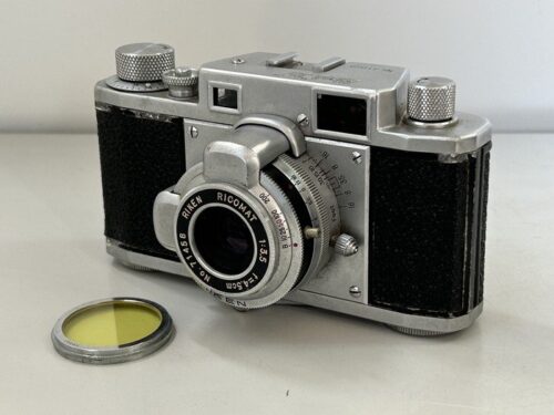 お預かりしたこのモデルは、1950年代に登場したリコーを代表するレンジファインダーカメラの一つです。最大の特徴は、ボディ底部にあるレバーを引いてフィルムを巻き上げる「トリガー巻き上げ方式」にあります。これにより、ファインダーから目を離さず迅速に次の一枚を狙うことができ、当時のスナップ愛好家たちに高く支持されました。搭載されたリケンリコーレンズが描き出す、どこか懐かしくも芯のある描写は、現代のレンズでは再現できない「昭和の空気感」を写し出す実力派モデルとして、クラシックカメラ愛好家の間でも信頼の厚い一品です。